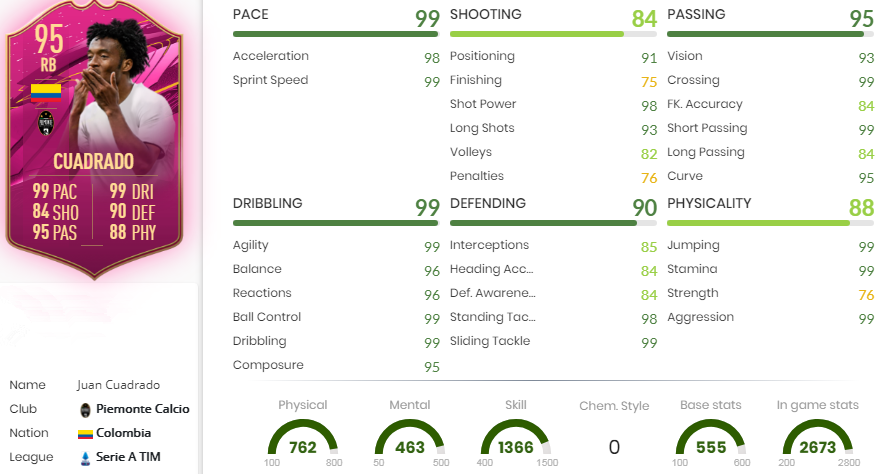 Having quite recently a 95 OVR is tricky when you really take a gander at the qualities this new FUTTIES form of Juan Cuadrado has where it matters most. None of his top credits fall under 84 appraisals, incorporating his ideal 99 in Pace and Dribbling. Underneath those, Cuadrado is concealing a galactic 99 in Sprint Speed, Agility, Ball Control, Dribbling, Sliding Tackle, Crossing, Short Passing, Jumping, Stamina, and Aggression. He's likewise got a 98 rating in Acceleration, Shot Power, and Standing Tackle to uphold that, with a couple other 90+ evaluations in Balance, Reactions, Composure, Long Shots, and Vision. Indeed, even his shortcomings aren't horrendous, with a simple 75 in Finishing and 76s in Strength and Penalties being the least details for FUTTIES Cuadrado.