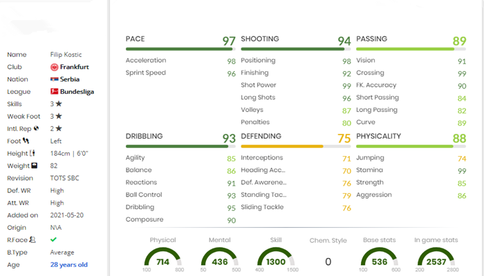 The qualities of this TOTS Filip Kostić are quickly clarified by his 93 OVR rating, however, the details that make up that rating are solid. The numbers are lead by his 97 in Pace, however, Kostić additionally has a 94 in Shooting and 93 in Dribbling. Under those appraisals, he has a 99 in Shot Power, Crossing, and Stamina, a 98 in Acceleration and Positioning, and extra 90+ evaluations in Reactions, Ball Control, Dribbling, Composure, Sprint Speed, Finishing, Long Shots, Vision, and Free Kick Accuracy.