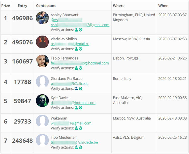 Second, let's check the list of winners list. The 7 winners are randomly chosen by the third party gleam.io according to their entries as long as the event ends. They will get the prize as follow,
